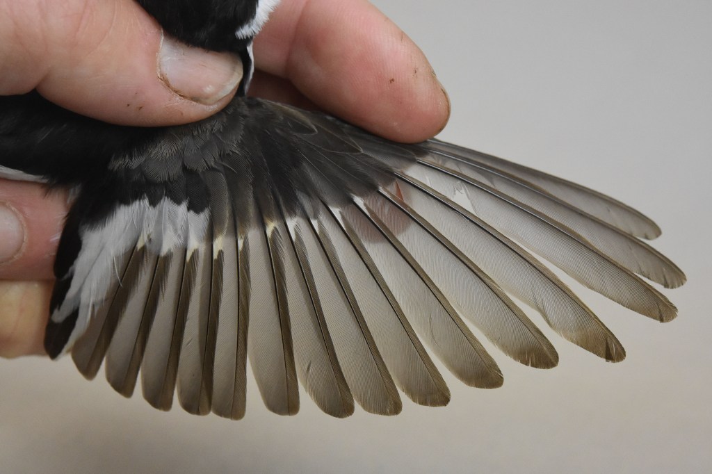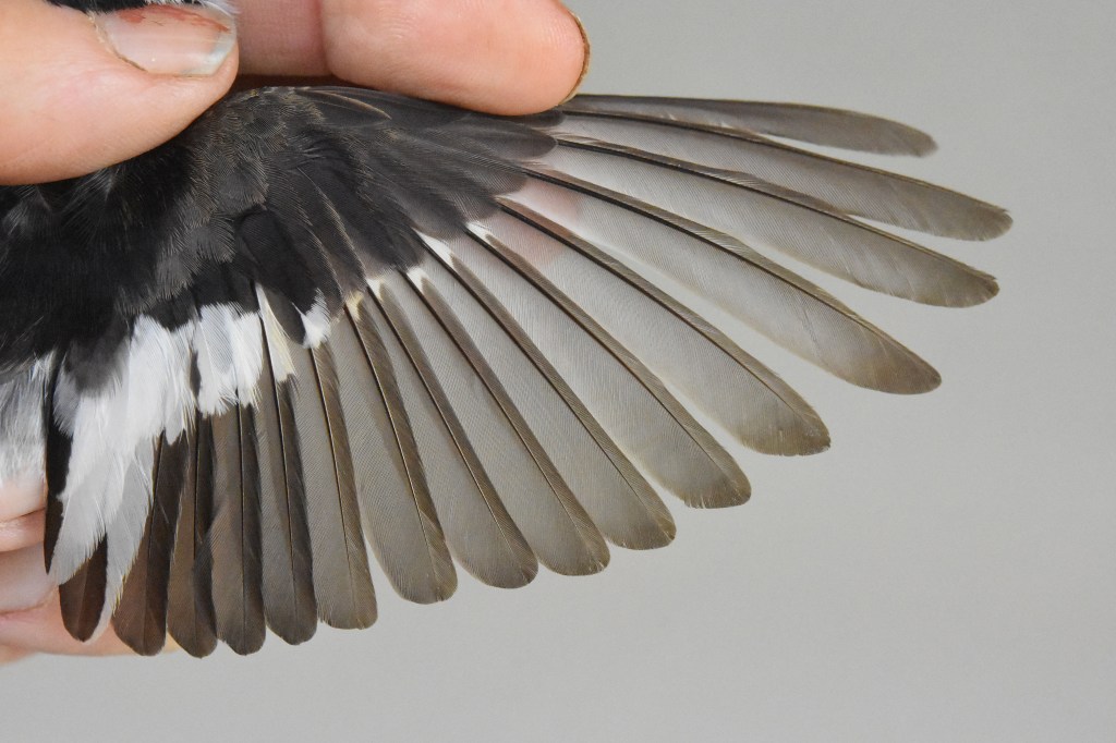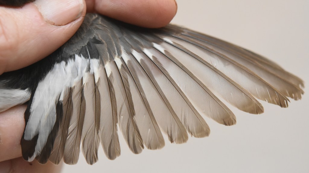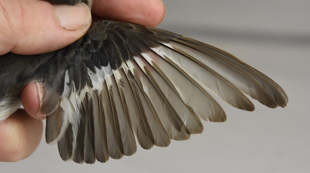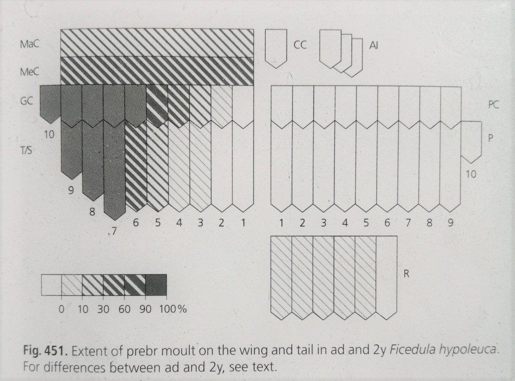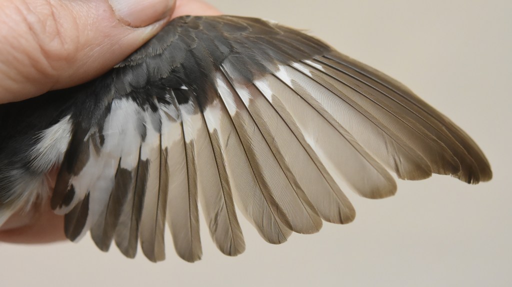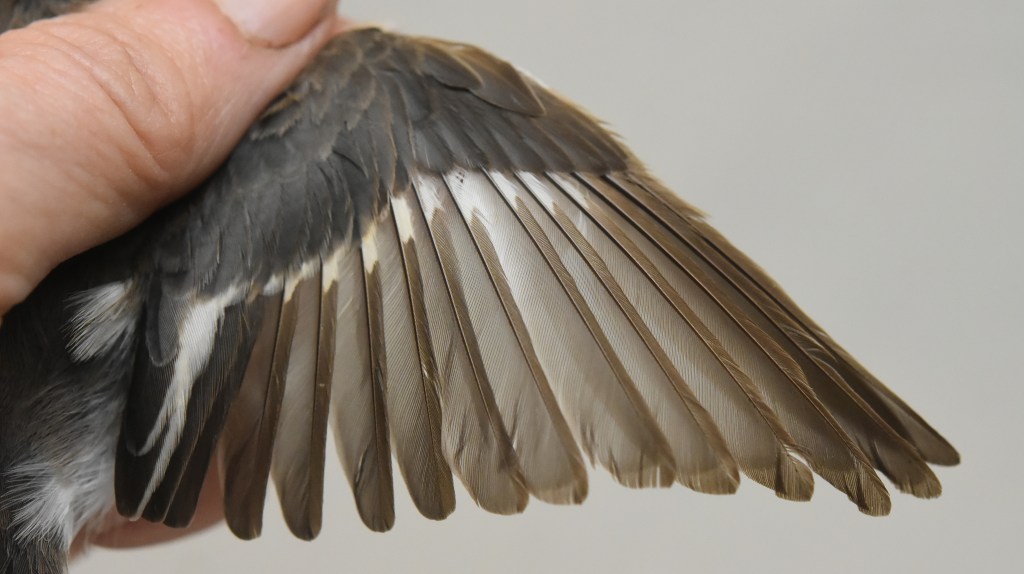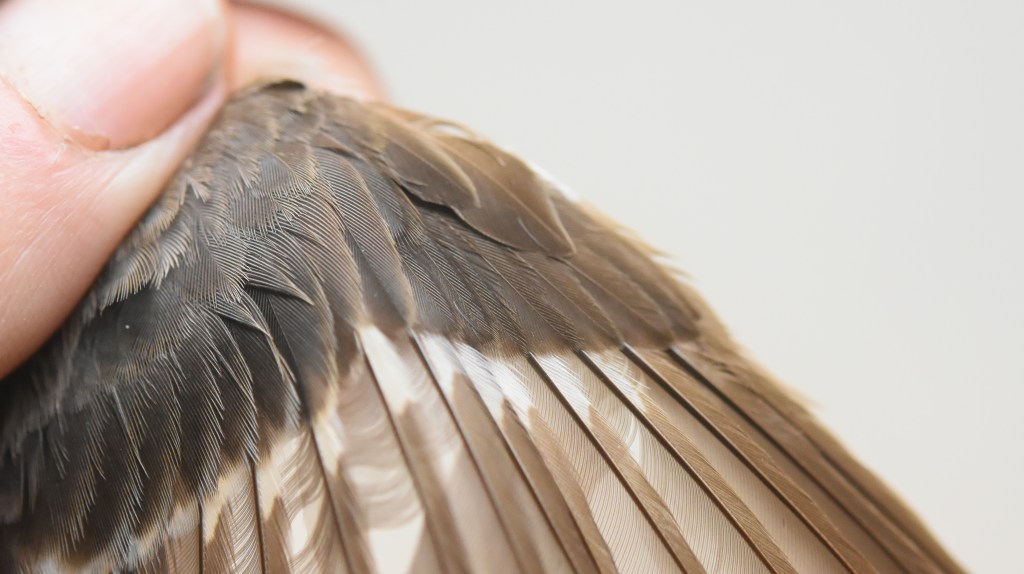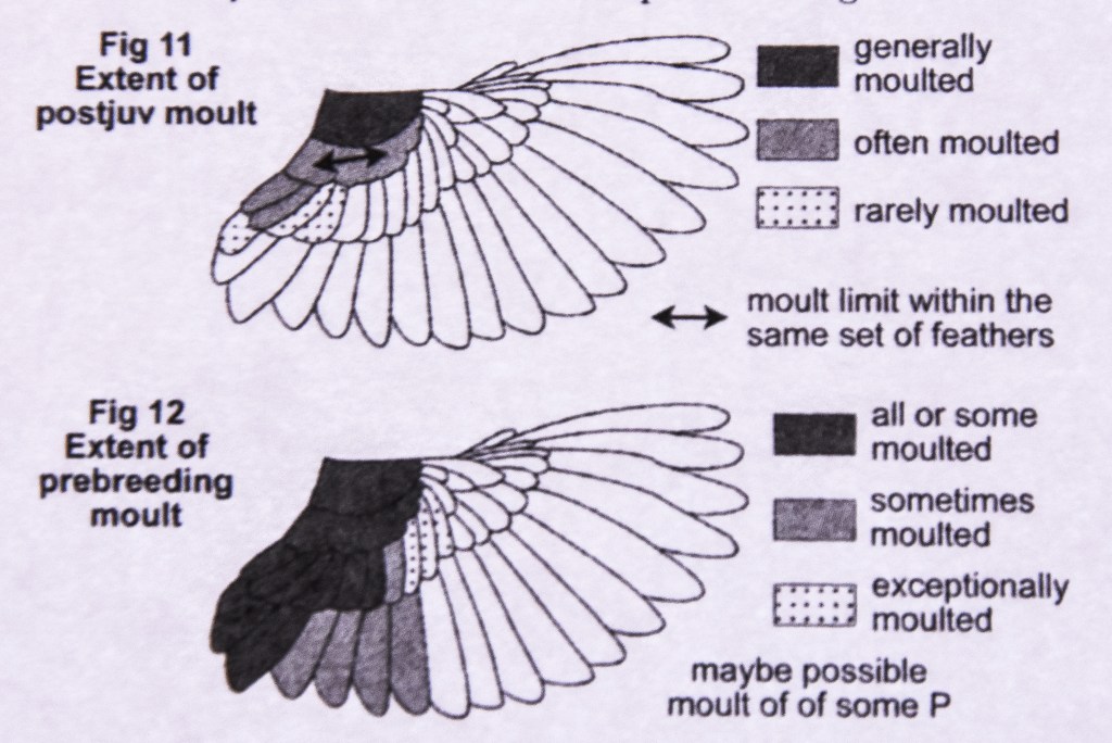 Kevättalvella vaihtumatta jääneiden ulompien peitinhöyhenten, tertiaalien ja kyynärsulkien ikäero on noin 2 kk ja niiden kasvuhistoriat ja laatu voivat erota. Sen vuoksi höyhenten haalistumisen ja kulumisnopeuksien ero näkyy höyhenissä ikäluokkien välillä. Etsi siis sulkimisrajat eri höyhenaloilta ja arvioi ovatko kevättalvella Afrikassa vaihtumatta jääneet höyhenet poikaspuvusta vai edellisessä elokuussa kasvaneesta aikuispuvusta, jossa kasvaneet höyhenet ovat kestävämpiä. Höyhenissä voi kulumiserojen lisäksi nähdä myös muotoeroja, kuten tämän oppaan kuvat havainnollistavat.